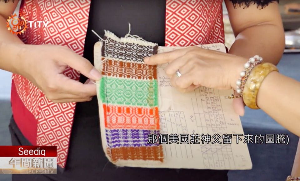 王小萍向我們分享:「當時有留下來這種這個圖卡,就是會有踏法跟綁法,然後也有示範它織出來的圖文是怎麼樣,我們現在都可以仿照他的。」記者問道:「這個就是當初,那個美國莊神父留下來的圖騰?」