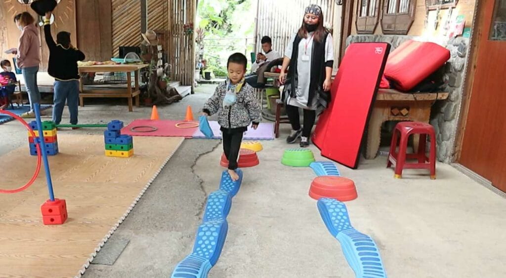 過圈環跟獨木舟,訓練孩子肢體發展能力與平衡感,還有角色扮演,練習算術或是認識蔬菜等,希望藉由四區域的不同遊戲體驗,從中了解孩童身心發展狀況,若觀察到孩童的差異,即可介入協助家長進行改善。