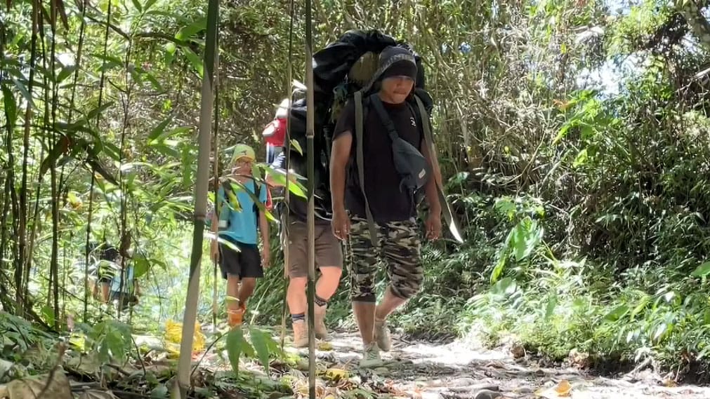 綁好背架上的物品,整裝出動,行走在山林小徑上,但深山裡到處充滿變數,必須腳踏實地,走穩每一步伐,高山協作,除了背負重達20公斤的裝備,更是登山客最好的領頭羊,帶領山友順利穿越山林到達目的地。