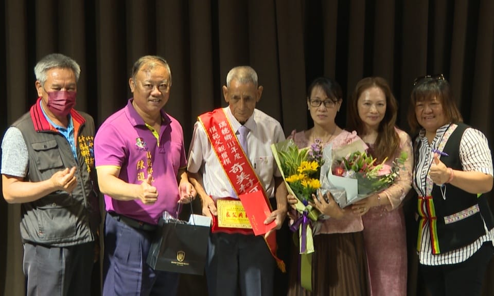 從鄉長手中接下匾額,接受大家表揚,家屬們也開心地一起合照。在父親節前夕,瑞穗鄉公所進行模範父親表揚活動,高齡82歲的Koic本次獲選為模範父親,家屬們也陪同他一起到場參與表揚活動。