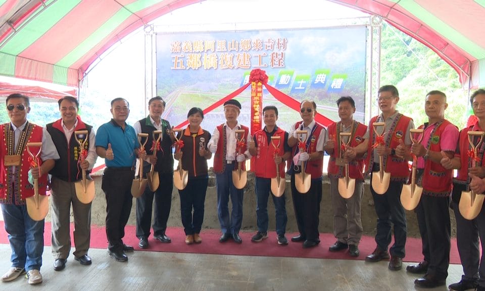 阿里山來吉村族人盼了13年的五鄰橋終於復建動工了!因八八風災,導致來吉村五鄰族人唯一的對外道路五鄰橋,遭到沖毀。多年來只能靠著簡易的便橋勉強通行,但每遇上大雨,就容易沖毀的便橋,族人根本無法放心。而在縣府、原民會等單位協助,以及全面性安全評估後,終於在今年完成經費核定,斥資1.2億的五鄰橋復建工程即將動工,來吉國小學生也獻唱歌謠,表達喜悅感謝。