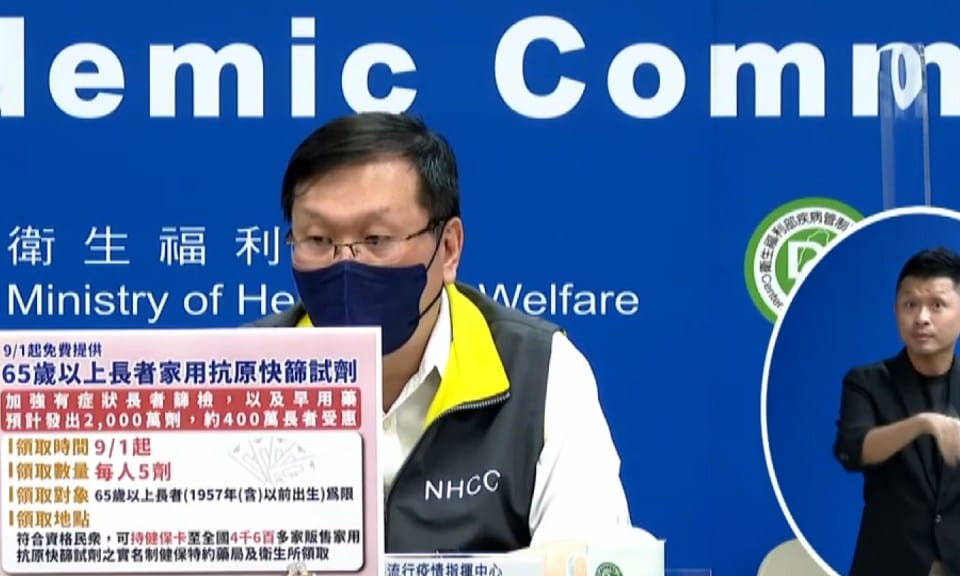 中央流行疫情指揮中心發言人莊人祥說:「我們在9月1號起,會免費提供65歲以上的長者提供這個家用快篩試劑。」