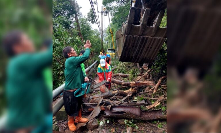 4維修人員駕駛挖土機清理路樹,替台電人員清出空間,因為杜蘇芮颱風夾帶強風豪雨席捲台灣,高雄桃源區27日清晨,發生樹倒塌壓斷電線事故。