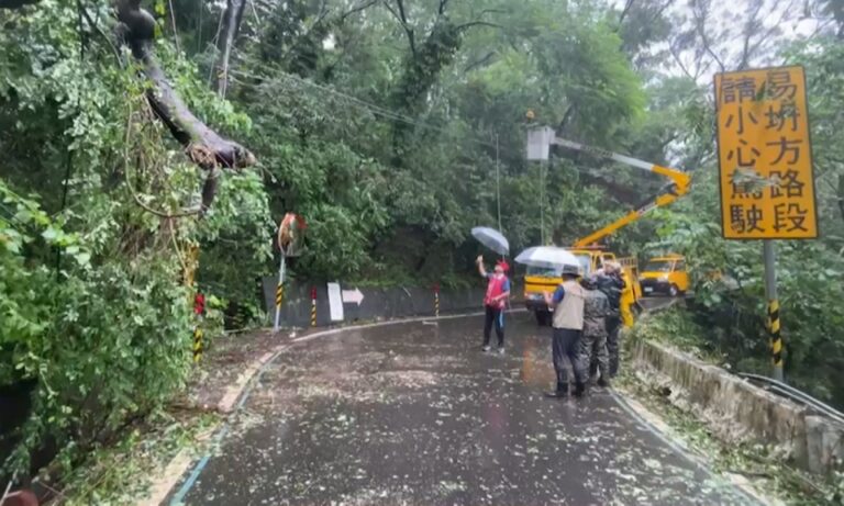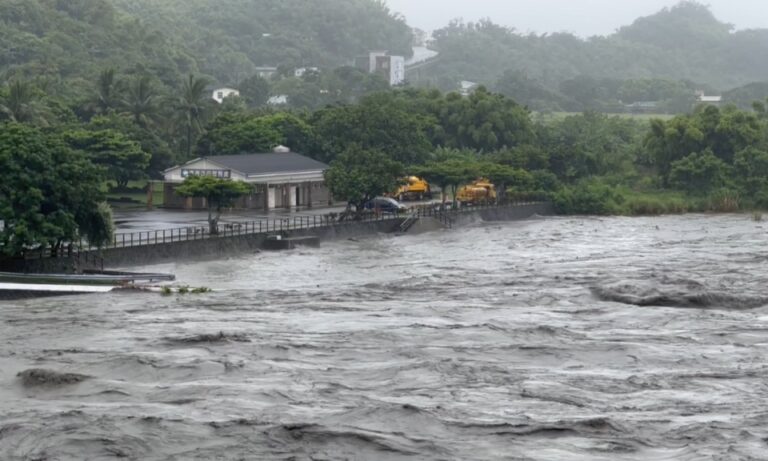 6記者 Kimliyan (陸萱):「記者現在位置在南投縣的仁愛鄉,雖然目前颱風沒有對仁愛鄉造成嚴重的災情,不過也可以看到山區的雨勢讓濁水溪暴漲,是相當地湍急;也可以看到漂流木載浮載沉,而鄉公所也將災害應變中心提升到了一級警戒,就怕外圍環流會持續帶來雨勢,讓部落對外聯外道路中斷,因此親愛村的村長是已經將儲備糧準備好,要來防範不時之需。