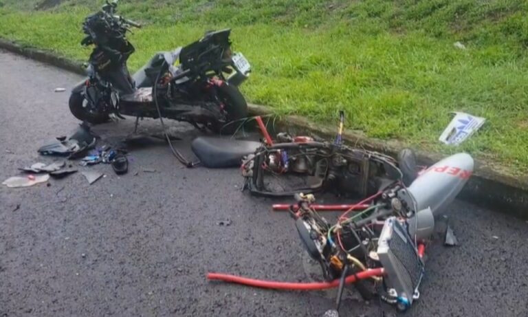 182屏東警消4日下午4點多接獲民眾通報,屏東高樹鄉廣福大橋堤防附近發生重大車禍,警方到場發現機車零件散落一地,其中一輛機車撞得幾乎解體,可見當時撞擊力道相當大。
