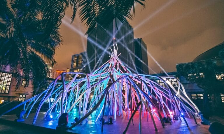 38作品是以部落的精神符碼「火源、火堆」做為整體造型,以漂流木為主體,象徵部落的生命核心,並且以部落古調為音樂創作的延伸,讓視覺、聽覺都能感受到來自祖先傳承的精神。
