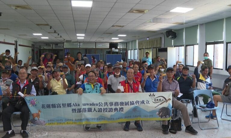 72眾人開心地高舉獵人證,一同見證協會成立,大家也非常期待這個由富里鄉10個部落集結而成的「Aka Sawaden公共事務發展協會」,未來能夠肩負起照顧部落的重擔。