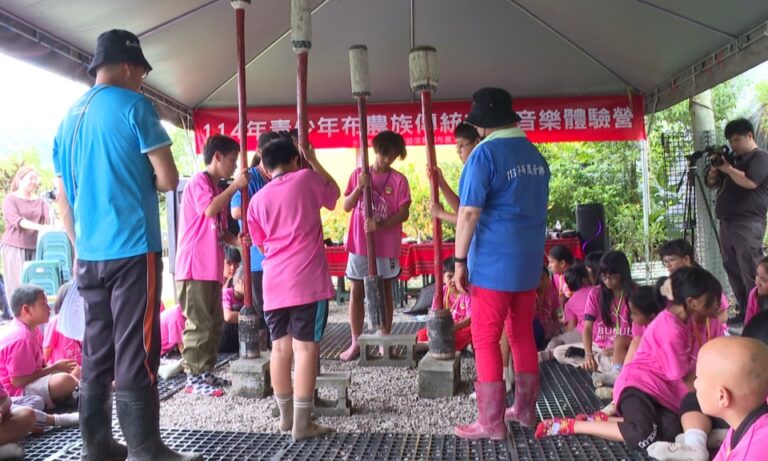 31在老師的指揮下,學習杵音的敲擊節奏,為了讓學生在暑假期間,能夠持續學習族群傳統文化,信義鄉布農文化協會,辦理布農族傳統文化音樂體驗營,讓學生體驗杵音、口簧琴等傳統樂器,也透過教導古調、歌謠合唱,更認識族群音樂藝術。