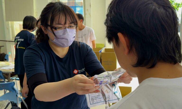 41民眾吹著氣檢查幽門桿菌,或是抽血、腹部超音波做進一步的篩檢,這是高雄醫學大學醫學系學生跟台東馬偕醫院合作,來到大武鄉大武村,深入社區免費提供檢查與健康諮詢,協助民眾及早掌握自身健康狀況。