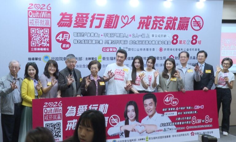 22由國健署攜手董氏基金會推動2026「戒菸就贏比賽」,以「為愛行動」號召民眾報名參賽,只要一位吸菸的參賽者和一位不吸菸的見證人,兩人一組,4月底前上「華文戒菸網」報名戒菸,5月2日至29日完全不吸菸,就有機會抽中成功戒菸獎金8萬元。