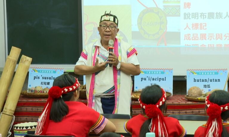 19手拿獎狀,在鏡頭前留影,為了推動本土語言的傳承,在彰化縣台灣母語日系列活動中,透過表揚推動有功的學校及教師,其中金光華老師在布農族語,榮獲彰化縣114學年度績優教師及教學支援人員獎,肯定他在彰化地區的族語教學。