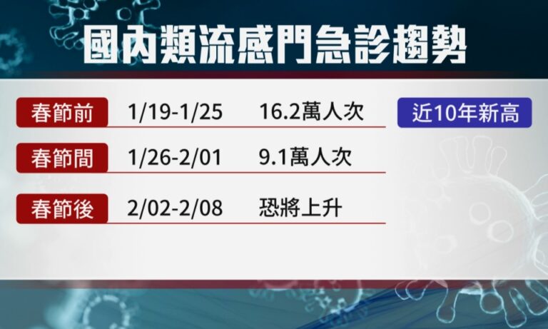 101民眾陸續返工,流感疫情也逐漸升溫,疾管署指出,春節前國內類流感門急診的就診人次,來到16.2萬人次,是近10年新高,而上周適逢春節連假,多數醫療院所門診休診,就診人次下降為9.1萬人次,疾管署也預估,這周也將再次反彈。