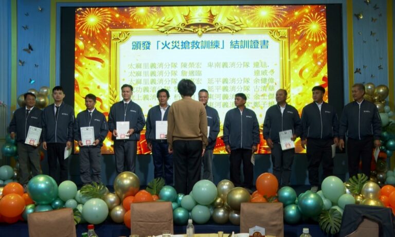 27義消們接獲火災搶救訓練的結訓證書,台東縣有超過百名以上的義消,雖然平時分散在各行各業,當災害或緊急事故發生時,總能第一時間迅速集結、即時出動,有效補充消防救災人力,尤其在台東地形多元、部落分布廣泛的環境下,在地義消熟悉地形地貌、道路動線及人文生態,能在救災行動中提供即時且關鍵的協助,是消防體系中不可或缺的重要力量。