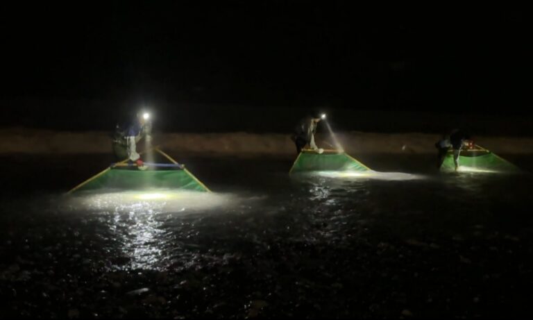 93天空漆黑一片、冷風又吹個不停,卻有人頂著海浪拍打的寒意,下水捕撈鰻魚苗;這裡是台東市海濱公園岸際,民眾趁著鰻魚苗洄游期間,穿著防寒衣跟雨鞋、利用頭燈和三角網,配合海浪漲退時機捕撈鰻苗。