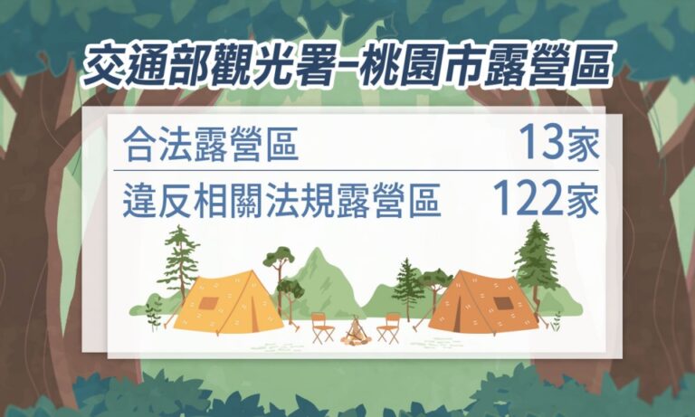 90根據「交通部觀光署露營場資料」,我國合法露營區僅占百分之八,而在桃園市,合法露營區僅13家、違反相關法規露營區共有122家;面對業者申請露營區合法的觀望,桃市政府從111年開始積極輔導業者,也設立「一站式輔導」,加速合法化的進程。