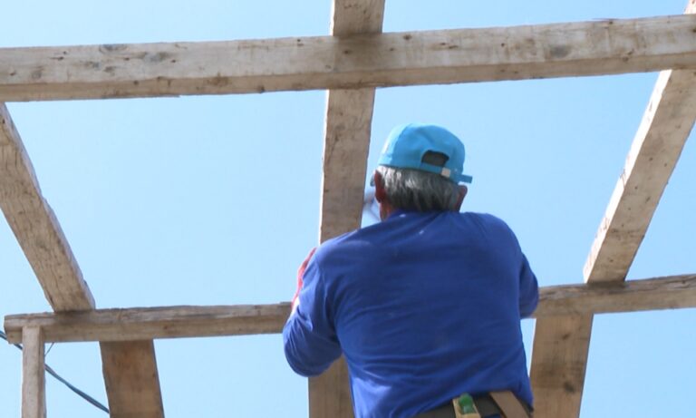49頂著豔陽、低著頭處理蘆葦,迎接澎湖縣原住民豐年祭,族人們趕在天氣好的時候,搭建瞭望臺、布置會場,連在地新住民也都加入行列,第一次參加也讓她相當興奮。