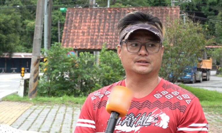 31記者 Rowbaw:「記者現在所在位置是在知名的廬山溫泉,也就是南投仁愛的精英村,根據當地族人說明,前兩天開始部落就開始有颳風的情況,現場也開始下小雨了,山坨兒颱風雖然還沒有帶來很大雨量,可是看到我後方的塔羅灣溪是非常地湍急,而且之前風災從上方沖刷下來泥沙淤積,也快跟旁邊的鋼便橋一樣高,甚至沒有營業的飯店,泥沙也衝進了裡面,那其實每次颱風一來一定都會預防性撤離,我們現在請精英村長說明目前預防性撤離的情況。