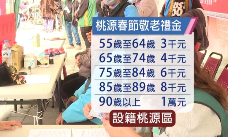 23春節將近高雄市桃源區為了照顧高齡長者並回饋區民,桃源區公所1/30發放春節敬老禮金,設籍在桃源區55歲至64歲可領3千元、65歲至74歲4千元、75歲至84歲6千元、85歲至89歲8千元、90歲以上1萬元,長輩也很開心,收到這份春節紅包。