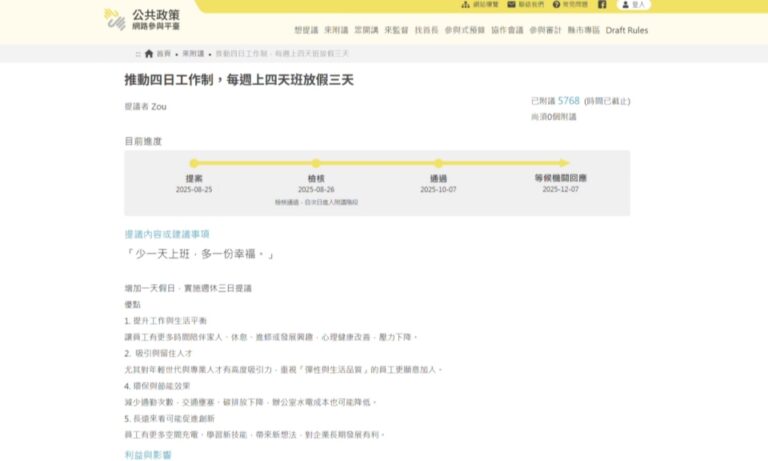 61今年有民眾在公共政策網路參與平臺上提案「推動四日工作制,每周上四天班放假三天」,已經超過5000人附議並正式通過成案,對於工時縮短民眾都樂觀其成。