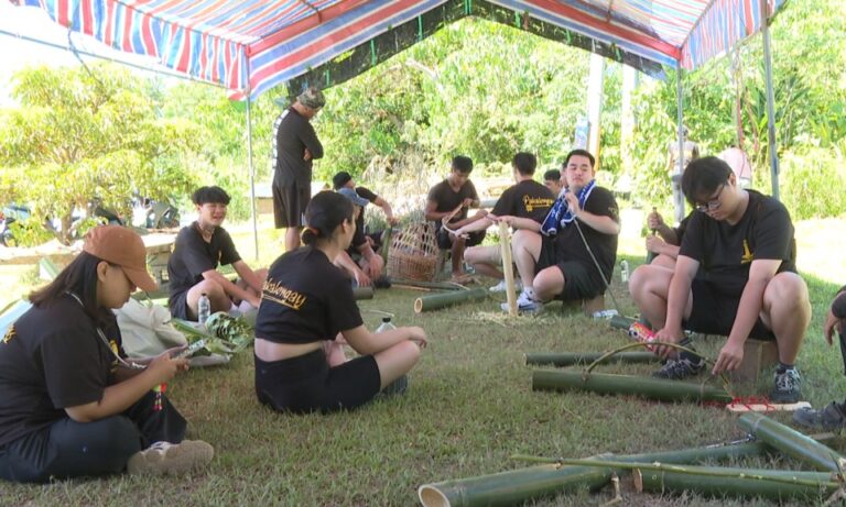 72馬荖漏部落Pakalongay訓練傳統生活技能課程,安排男生以自然素材竹子製作盛水用的竹筒,Pakalongay親手鋸竹、鑿洞、削皮、彎曲手把等工序。