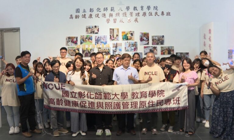 275揭開布條,彰化師範大學高齡健康促進與照護管理原住民專班,正式開展,會場有原專班學生的簡介、各族群的傳統工藝品和服裝等,其中也包含原專班今年度的學習點滴,介紹原專班的課程內容。