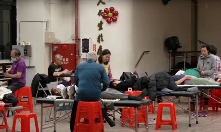 118前往基隆里民活動中心,許多長者正舒服地躺在床上透過拍打活絡筋骨,就連社區大樓外也隨處可見長者正在聊天,幾乎很少看到年輕身影。