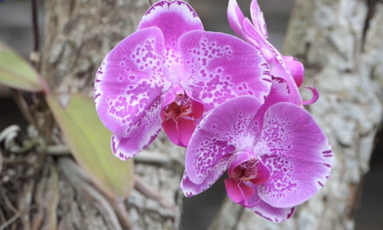 24粉紫色的花朵亮麗綻放,兩邊的花瓣紋路像隻美麗的蝴蝶,相當吸睛,這裡是金崙溫泉地區的大武山生態教育館,館員辛苦的將台灣原生種的蘭花,種植在館區周圍的樹木上,來美化周邊環境,正值開花期間,不過,近期疑似遭不明人士竊取。