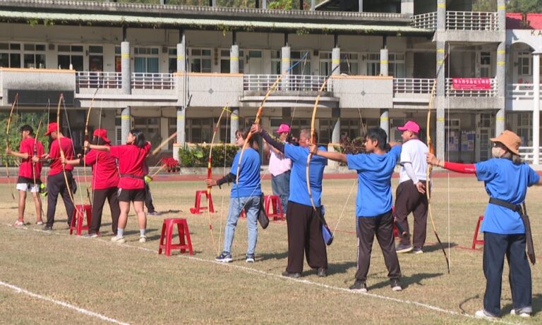 27射箭選手聚精會神瞄準靶上目標,高雄那瑪夏「主席盃暨運動嘉年華」24日在那瑪夏國中熱鬧登場,近200族人共襄盛舉,進行傳統射箭、搗小米、槌球等運動。