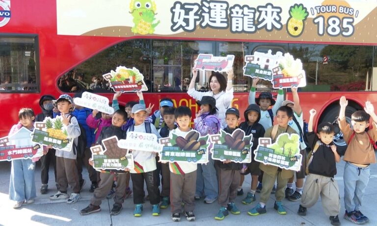 156一群小小遊客,在屏東縣長周春米的陪伴下,由水門轉運站搭乘「好運龍來185」雙層巴士,沿途吹著涼爽的自然風,以「上帝視角」由上往下的視野,欣賞185線沿路獨特的風光和美景。