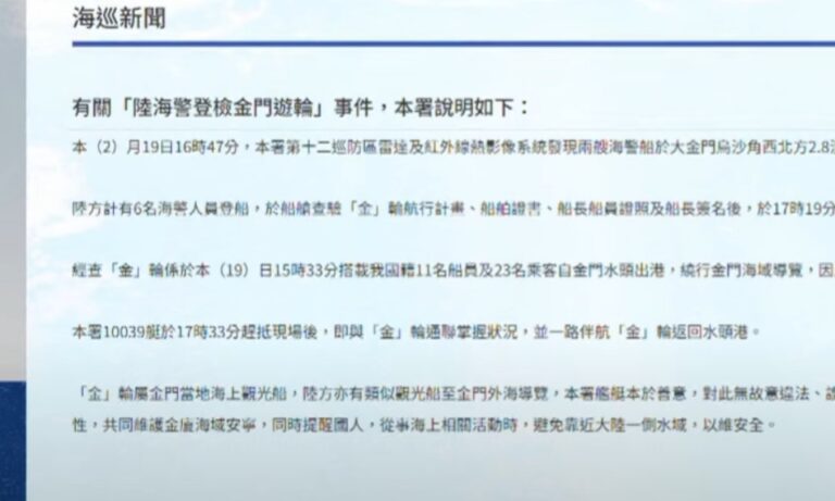 15海巡署19日下午發現,中國兩艘海警船併靠登檢我國觀光船、嚇壞船上遊客,日前才發生中國快艇越界翻覆,導致船上4人落海2人喪命,台海事件頻傳也讓民進黨立委質疑,對岸是在模糊我國海域空間。