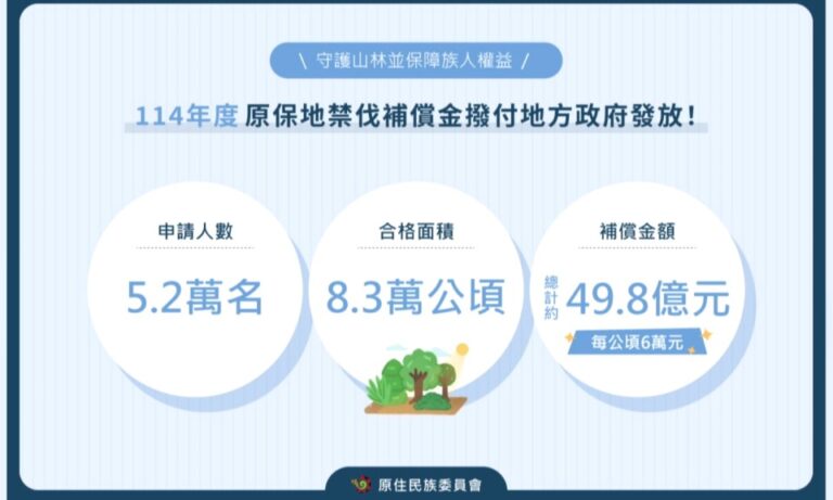 108為守護山林並保障族人權益,總統於113年6月24日公布《原住民保留地禁伐補償條例》修正案,自114年起,禁伐補償金由每公頃新臺幣3萬元提高到6萬元。