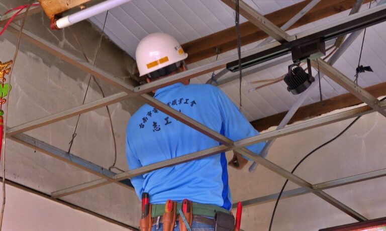 8修繕師傅更換天花板,一旁還能看到煙燻痕跡,台南市新營區今年10月發生一起民宅電線走火意外,屋主是移居都會區的排灣族人,家園因火災無法居住,但經濟狀況不佳,無法籌出維修費用,對此原民會、勞工局、慈善機構合力,也申請弱勢原住民建購修繕住宅補助,終於5號修繕完工。