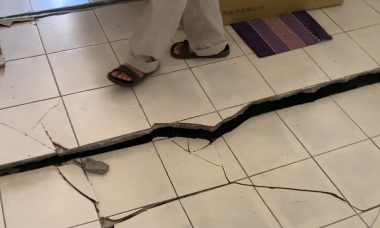 21走進屋子裡,牆壁上隨處可見地震留下的傷痕,超過一個拳頭寬的縫隙,能夠從屋內直接看到屋外,客廳地板更是嚴重傾斜,裂縫深不見底。
