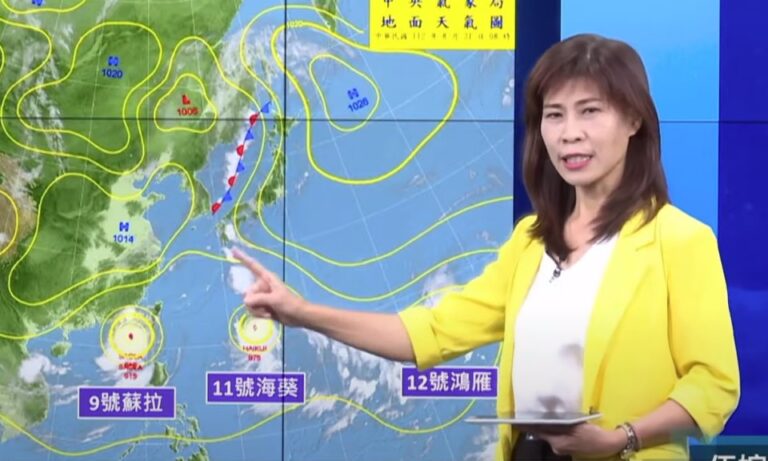 4氣象局簡任技正 伍婉華:「氣象局解除蘇拉颱風海上警報,如果第十一號颱風海葵未來移動的方向與速度正如我們所預估,氣象局將在明天白天發布海上颱風警報。