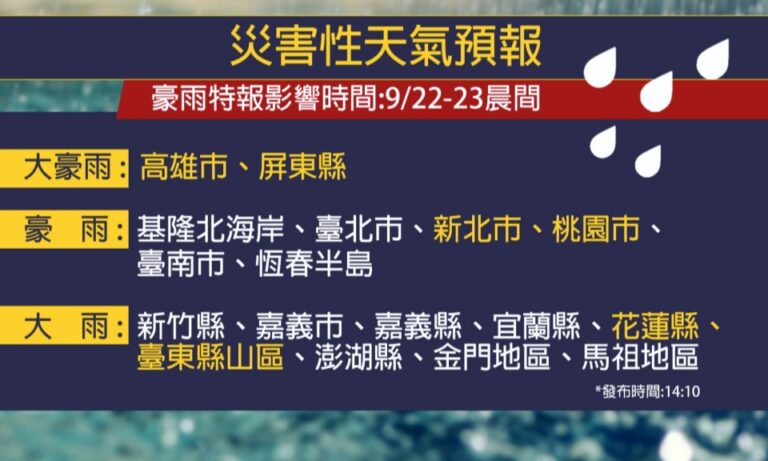 22日雨勢下得猛烈,兩大區塊累積雨量都呈現紅通通的,就是北部地區、南台灣和金門馬祖一帶,都有相當顯著的陣雨、雷雨和短延時強降雨持續一整天,氣象署也發布豪雨特報,像是要預防大豪雨的高雄市和屏東縣;基隆北海岸、雙北地區和桃園市等6個縣市,發布豪雨特報;花蓮縣和台東山區則是要預防大雨,直到23日早上8點雨勢會趨緩,但雨還會持續下,將一路影響到周二24日清晨。
