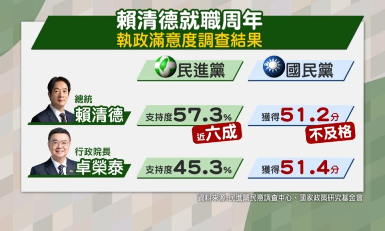 政經 上任周年 朝野民調 總統賴清德 綠營民調賴清德近6成支持度 藍營打不及格! 946 隨著總統賴清德就任滿一周年,朝野黨團也分別端出了民調數字,以民進黨最先公布民調結果,並且提到說雖然年初支持度曾一度下滑,但到了四月分遭逢美國對等關稅議題,政府進行因應對策,支持度又穩定回升。 2025-05-19 19:03