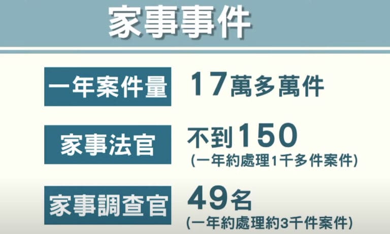 專門處理人與人、身分、親子、婚姻以及家庭之間關係的《家事事件法》,從2012年6月1日頒布至今,已經過去了十年,但現在就有民間團體發現,家事事件從原本一年大約15萬的案件量,至今已經增長到17多萬件,但在人力資源上,家事法官不到150名,甚至家事調察官只有49名,民團就表示,司法機關投入家事事件的人力,根本遠遠不足實際需求。