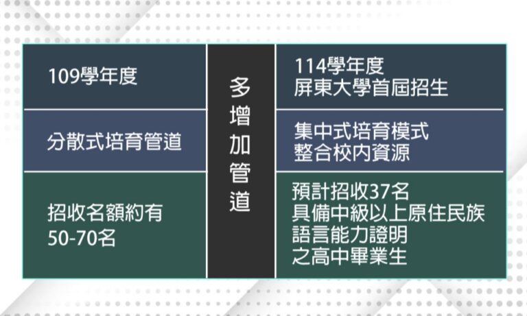 為了培育更多原住民教師,返回原鄉學校執教鞭、同時又能傳承文化,教育部將在114學年度起,推動《原住民國民小學師資培育公費專班試辦計畫》,讓有志從教的原民學生,獲得學雜費減免與生活津貼等補助,減少經濟壓力,又能兼顧師資培育與族語增能,畢業後即可投入原住民重點學校任教。