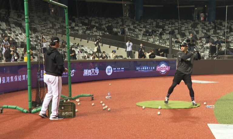 記者 Iwan Nawi:「球迷們引領期盼的Team Taiwan熱潮將持續延燒到2025WBCQ世界棒球經典賽資格賽,而為了讓中華隊提前適應國際賽事的節奏及強度,12日及13日在台北大巨蛋與韓國樂天巨人隊進行交流賽,也提早讓中華隊提前備戰,而現在場上進行的是中華隊練習的畫面。