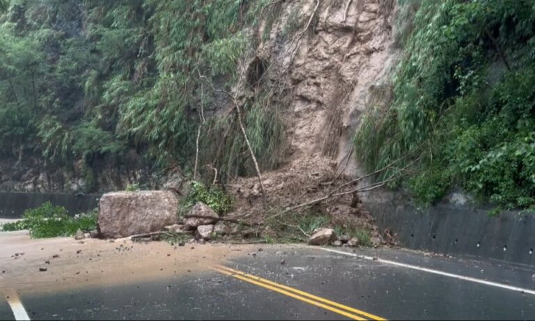 生活 台23線 台東東河 道路坍方 雨炸台東東河 台23線多處路段邊坡坍方 16 台23線45K處邊坡受豪雨侵襲含水量飽和下,土石突然崩落巨石並佔據路面,令人怵目驚心,同時在41K處,邊坡也發生大面積坍方及石塊掉落的狀況,工程人員才清理完一處坍方,另一處又發生落石,讓他們實在傷腦筋。 2023-09-01 19:07