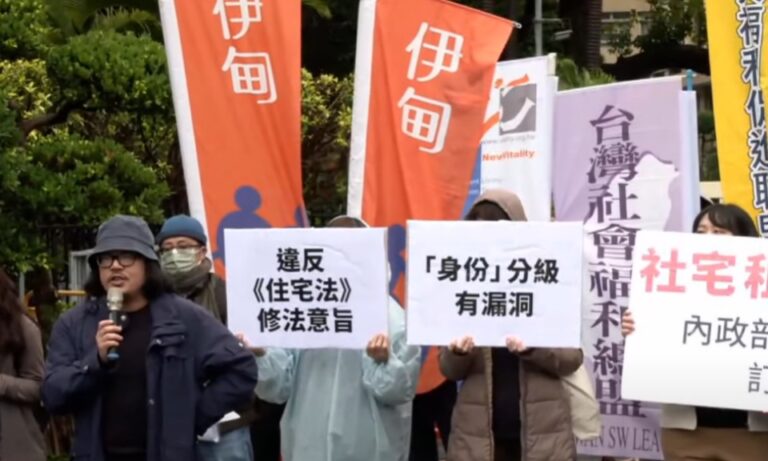 「社宅不能開倒車!」 在寒風細雨下高舉標語喊口號。