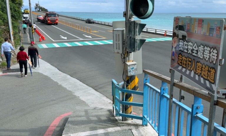 火車呼嘯而過,拿起手機拍照留念,有全台最美車站之稱的多良車站,每年吸引約10萬人到訪,一旦遇到假日,車站下方的省道,總是停滿車輛,容易造成人車爭道的現象,為了維護行人安全,在路口用三角錐增設行人徒步區,使遊客步行進入火車站時,動線明確,視線良好也更加安全。