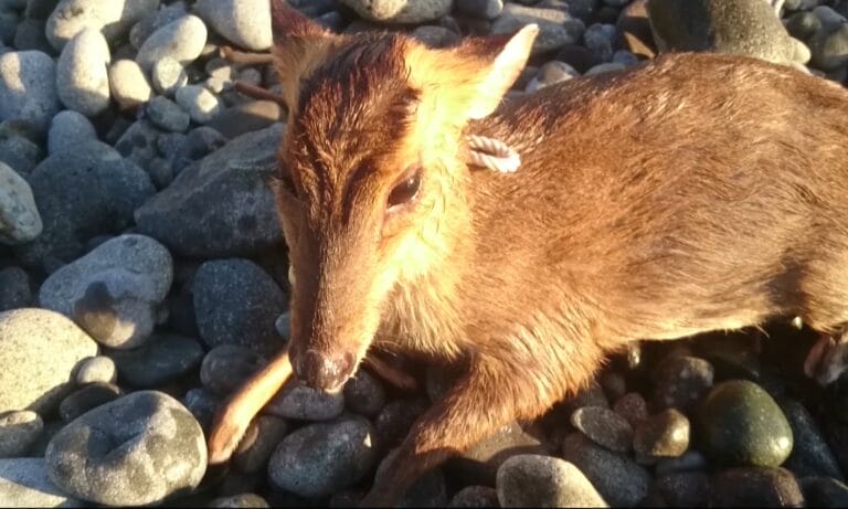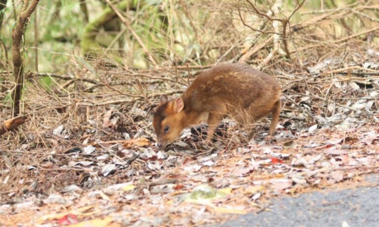 園區道路旁,有一隻小小的身影不停徘迴,還時不時發聲鳴叫,原來是一隻落單的小山羌,雖然玉管處現場工作人員有試圖要將小山羌轉移到安全地帶,但考量野生動物天性過後還是讓牠在原地等待。
