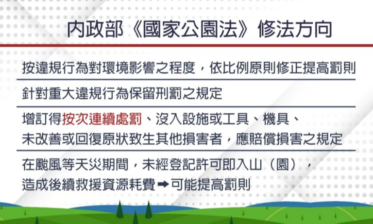 政經 國家公園法修正草案 引火整地 焚燬草木 國家公園法立委加重違規罰則 內政部表尊重 94 去年有一行人在屬於太魯閣國家公園區內的合歡山,煮起火鍋,遭太管處追緝開罰,而在山林開發之後,國家公園也接連發生放煙火、沖天炮、燒紙錢等違法情事。 2025-01-06 19:06