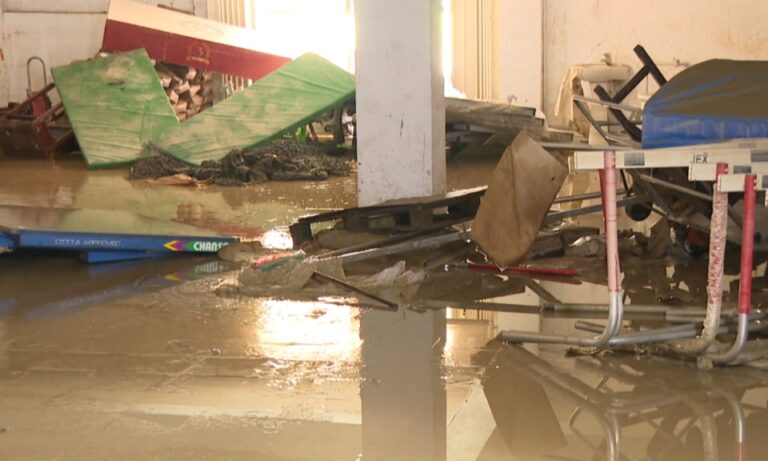 記者 si Aitan(邱依婷):「現在記者所在的位置,是在蘇澳海事的活動中心地下室,那可以看到現場幾乎是一遍泥濘,還有一些翻覆的桌球桌,但其實在稍早幾乎這裡的水,是淹到一個成人的高度,那這次的淹水也造成蘇澳海事有不少的災損,那我們來聽總務主任的說明。