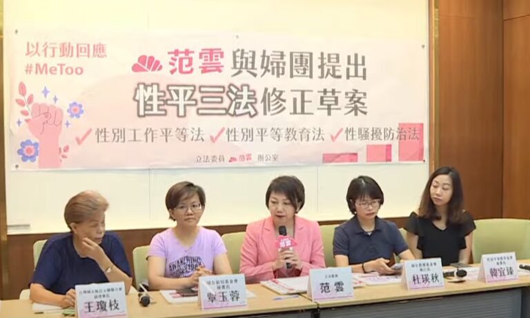 台灣Me Too運動延燒不斷,凸顯我國性別平等相關法令的結構失靈,行政院預計下周提出《性別工作平等法》、《性別平等教育法》、《性騷擾防治法》等性平三法修法,為此,立委范雲與多個婦女團體6號召開記者會,率先提出民間版四大重點修正草案。
