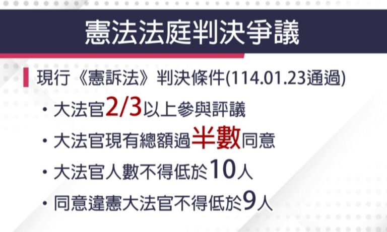 政經 憲法訴訟法 立法院大戰 議事流程疑慮 憲法法庭開說明會 查「憲法訴訟法」申請案 56 立法院去年三讀通過的《憲法訴訟法》,民進黨團提出暫時處分,12日憲法法庭召開說明會,大法官主要確認三讀程序過程,以及詢問雙方、學者立場。 2025-05-12 19:44