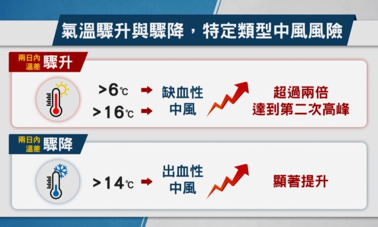 國家衛生研究院14日公布一項最新研究,提醒大家氣溫變化太劇烈,可能會讓中風風險大大提高。