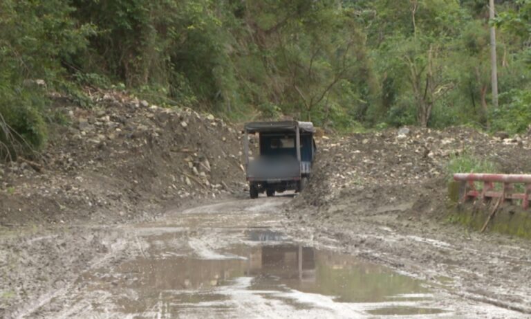 車輛小心翼翼地穿越土方中央,以免不小心就碰撞到兩側的石頭,這裡花64縣道16.5公里處的奇嚴橋路段,原本12公尺寬的道路因為去年康芮颱風造成邊坡土石沖刷而下,造成道路峽谷的奇特現象,遊客行經這邊時也打趣地說以為是新的景點,而沿途路況也讓他們開得膽顫心驚。