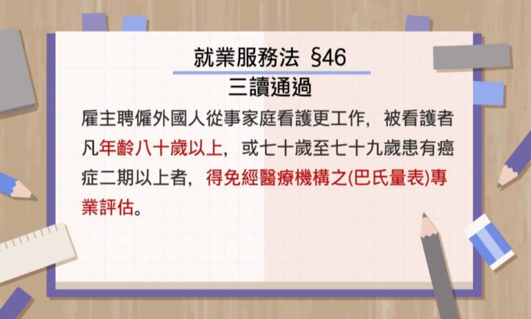 搶在2024年最後一天,針對就業服務法第46條修正案,立法院三讀通過國民黨團再修正動議,未來公告實施後,被看護者年滿80歲以上,或70至79歲間,罹患二期癌症以上,在聘僱外國看護時免經醫療機構,以巴氏量表專業評估。